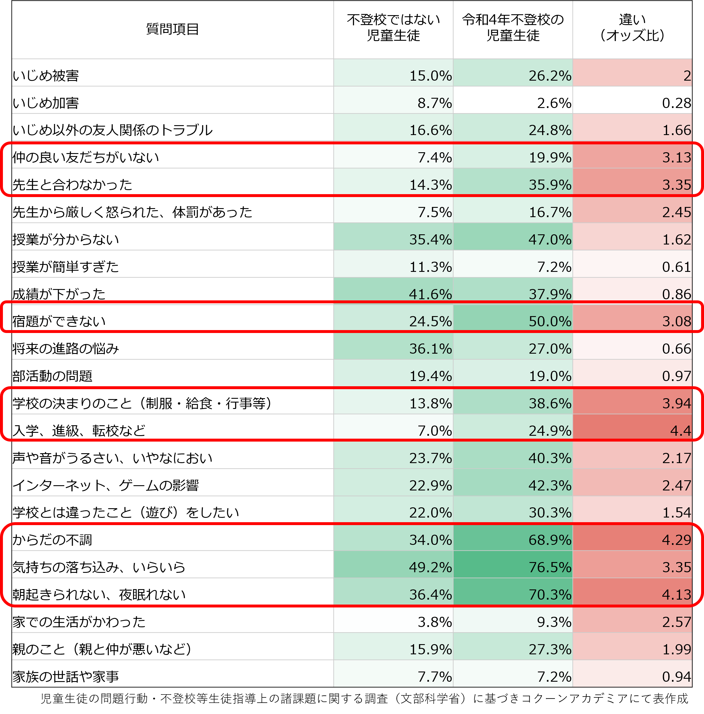 表では、数字が大きいほど濃い色になるよう着色しています。また、オッズ比が3以上の項目は赤い枠線で囲んでみました。赤い枠線で囲まれている項目は「不登校との関連性が特に高い」と考えられます。
